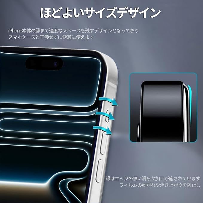★【ほどよいサイズデザイン】縁はエッジの無い滑らか加工が施されています、iPhone17Promax本体の縁まで適度なスペースを残すデザインとなっており、フィルムの剥がれや浮き上がりを防止し、スマホケースと干渉せずに快適に使えます。