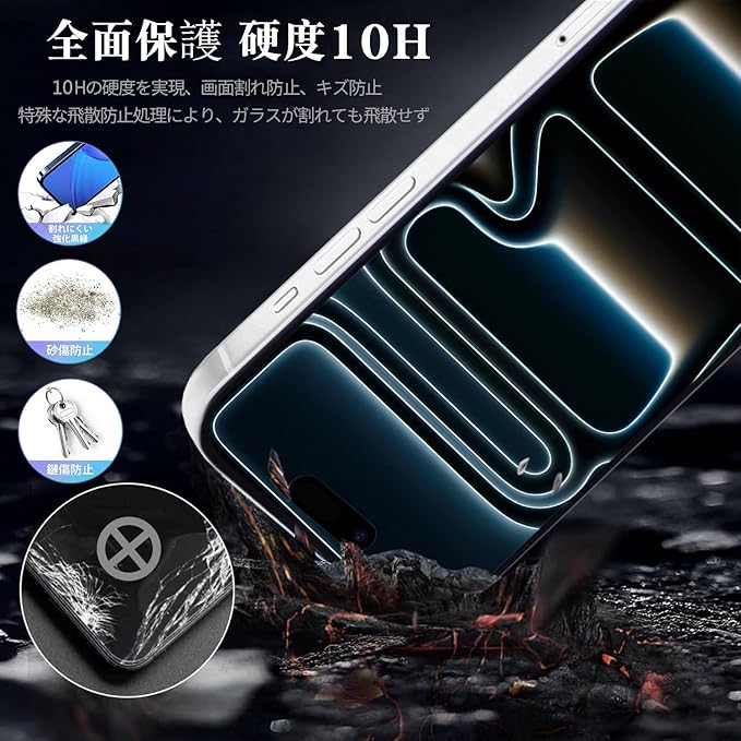 ★【高品質素材製、日本旭硝子製】一般的なガラス保護フィルムよりも耐久性に優れたハードコーティング技術により、10Hの硬度を実現。特殊な飛散防止処理により、ガラスが割れても飛散せず、破片が付着したときに携帯電話の画面を傷から安全に保護できる。DZHFUのいphone液晶保護フィルム 一般的な製品に比べ3倍以上の保護力があり。
