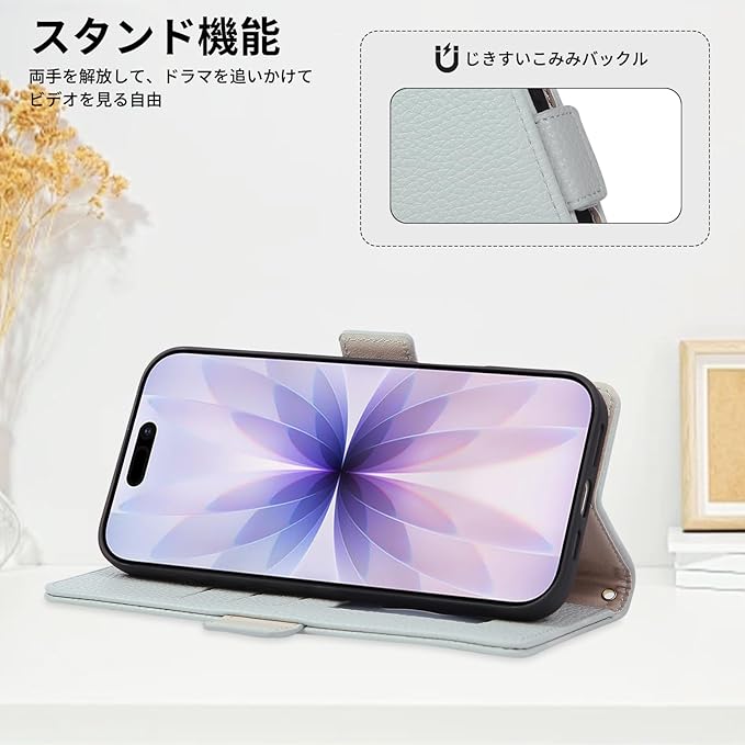 【カード収納 横置きスタンド機能】手帳型ケースは便利なカードスロットが3つと、大型ポケットを1つ搭載されて、カード、お札、チケット、定期券、名刺などをポケットに収納でき、1つで出掛けられる手軽さ。便利な横置きスタンド機能が付き:背面を折り曲げることにより、スマホを横向きで固定可能、キッチンやデスクで作業をしながら、手軽に動画コンテンツを視聴できる。