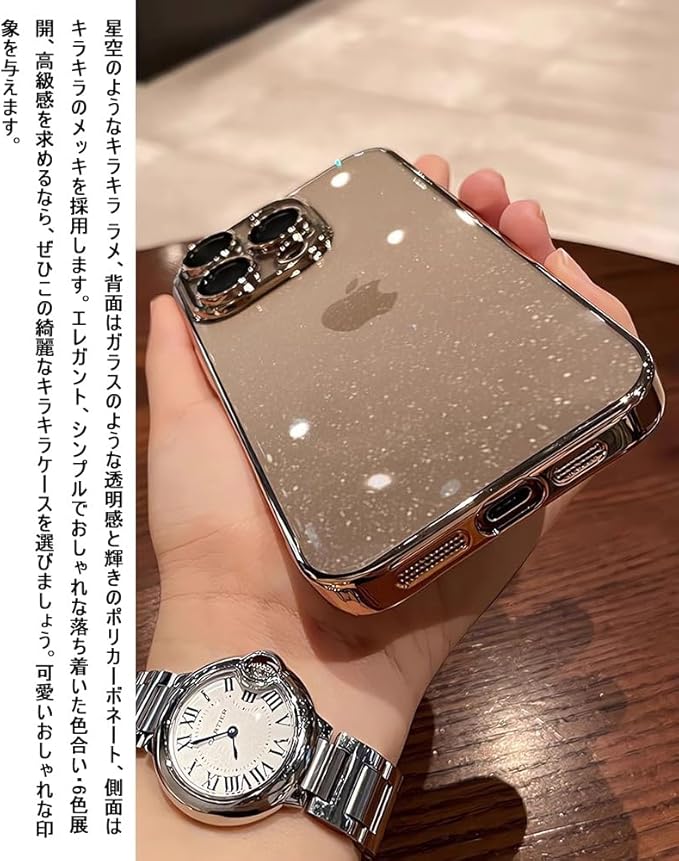 【高級感漂うキラキララメ+ストラップホール】星空のようなキラキラ ラメ、背面はガラスのような透明感と輝きのポリカーボネート、側面はキラキラのメッキを採用します。エレガント、シンプルでおしゃれな落ち着いた色合い・6色展開、高級感を求めるなら、ぜひこの綺麗なキラキラケースを選びましょう。可愛いおしゃれな印象を与えます。左下にはストラップホールがあり、お好きなストラップも付けられます。