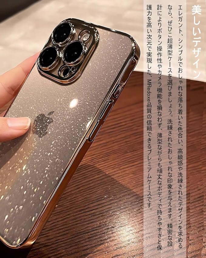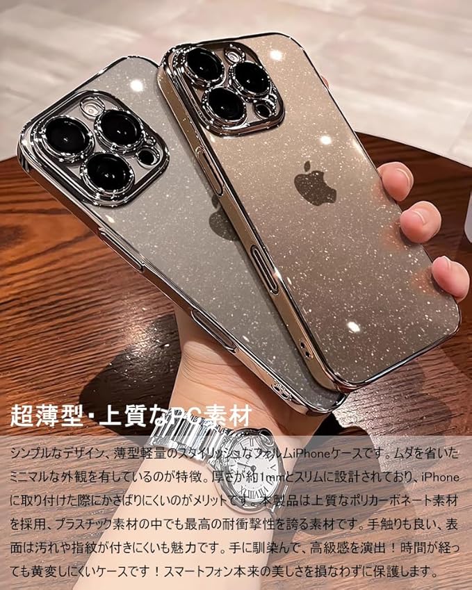 【超薄型・上質なPC素材】、【一体型カメラレンズ保護】、【高級感漂うキラキララメ+ストラップホール】、【美しいデザイン】