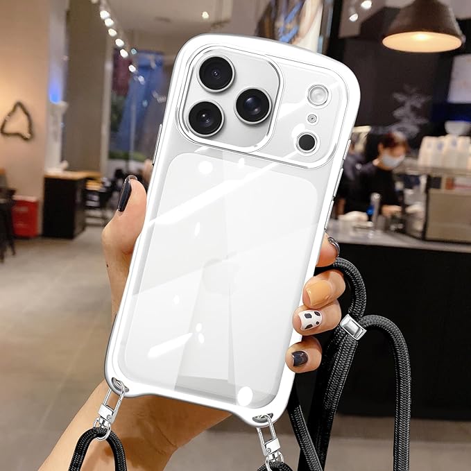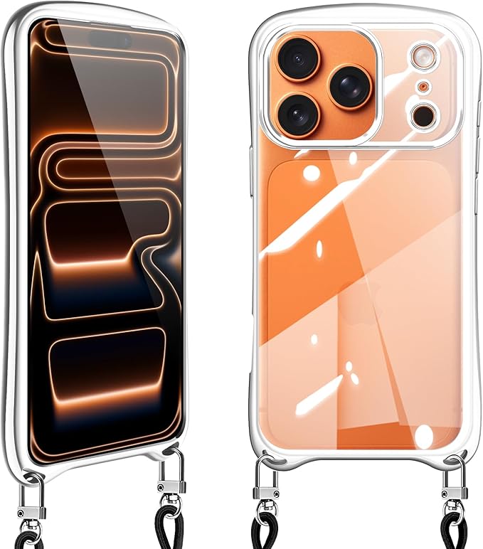 iPhone 17 Pro Max 用の ケース ショルダー クリア いphone17 pro max スマホケース アイフォン17pro max カバー 耐衝撃 肩掛け 首掛け 可愛い かわいい 韓国 透明 TPU メッキ加工 TPUバンパー 長さ調整可能 取り外し可能(シルバー)