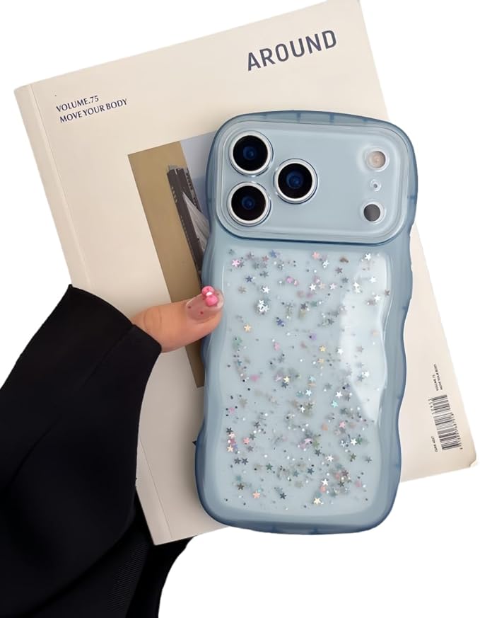 きらきら 対応iPhone 17 Pro Max ケース クリア 透明 ラメ入り 星 キラキラ ウエーブ 波型フレーム かわいい 17 Pro Max用カバー 大人 可愛い デコレーション 女性 人気,ブルー