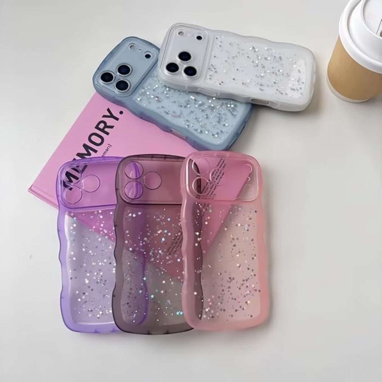 大人可愛いきらきらケース:ラメ入りで大人かわいいキラキラケース、ラメと星がきらきらしてシンプルすぎず派手すぎ、ほかにない可愛さで目を引きます。