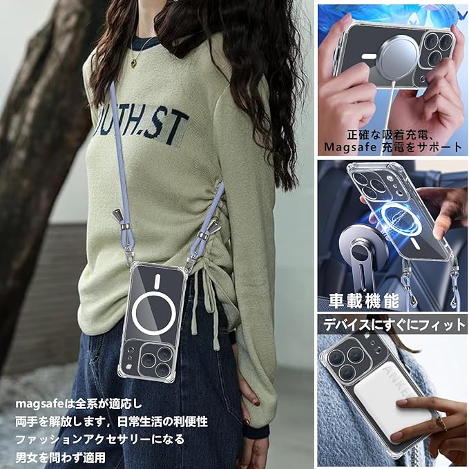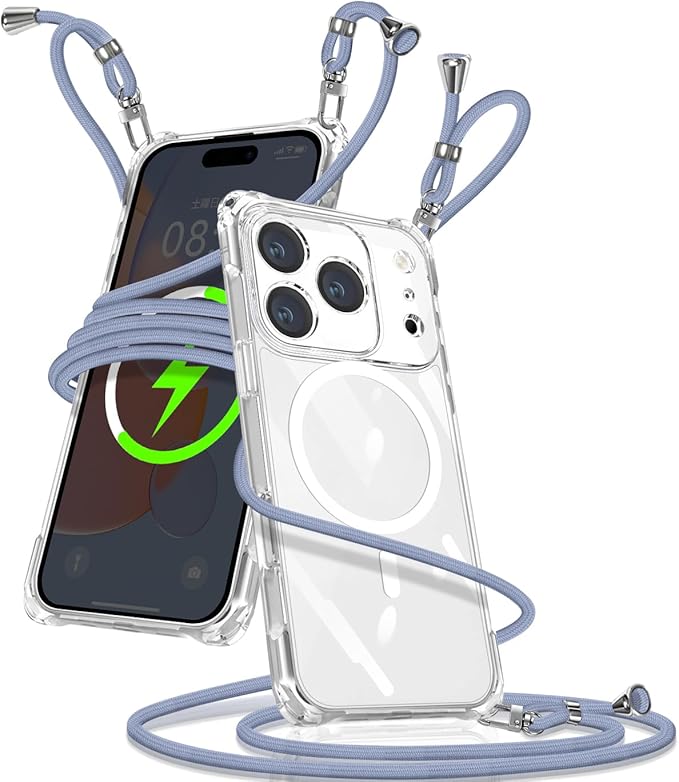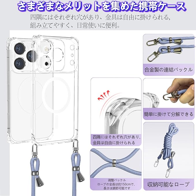 ケース 用の iPhone 17 Pro Max クリア ショルダー カバー 肩掛け 斜めかけ 縄掛けケース 透明 TPU 携帯ケース 紐付き 織りストラップ付き 長さ調整可能 取り外し可能 紛失防止 落下防止 ワイヤレス充電対応(グレーブルー)
