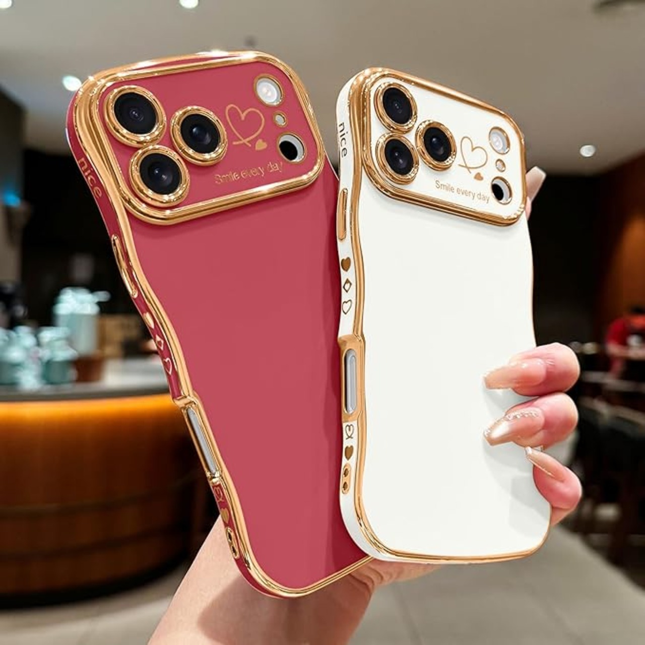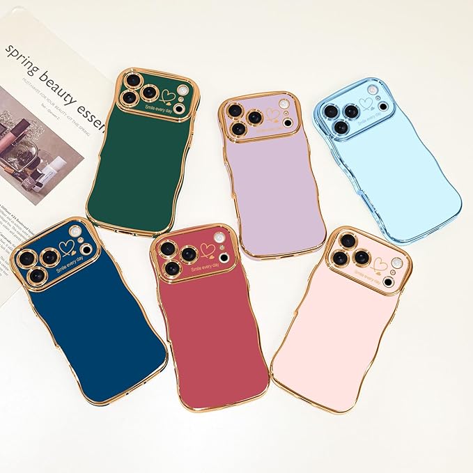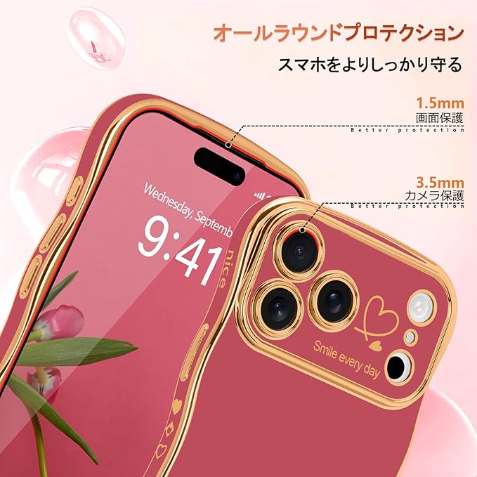 【おしゃれで握りやすいデザイン】 ウェーブ状の湾曲縁が特徴的なデザインは、見た目のおしゃれさだけでなく、驚くほど安定したグリップ感を実現。背面の電鍍メタリックフレームと大きなハートウィンドウが、可愛らしさと洗練された印象を添えます