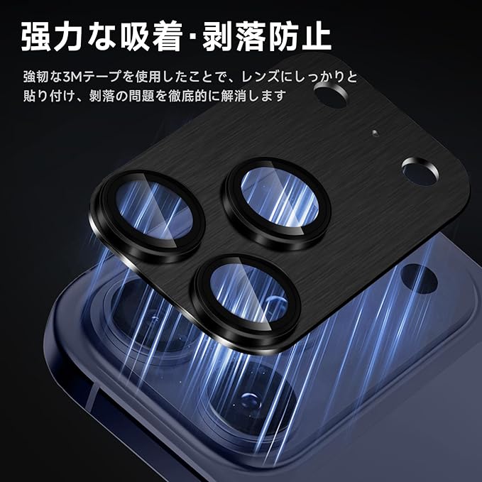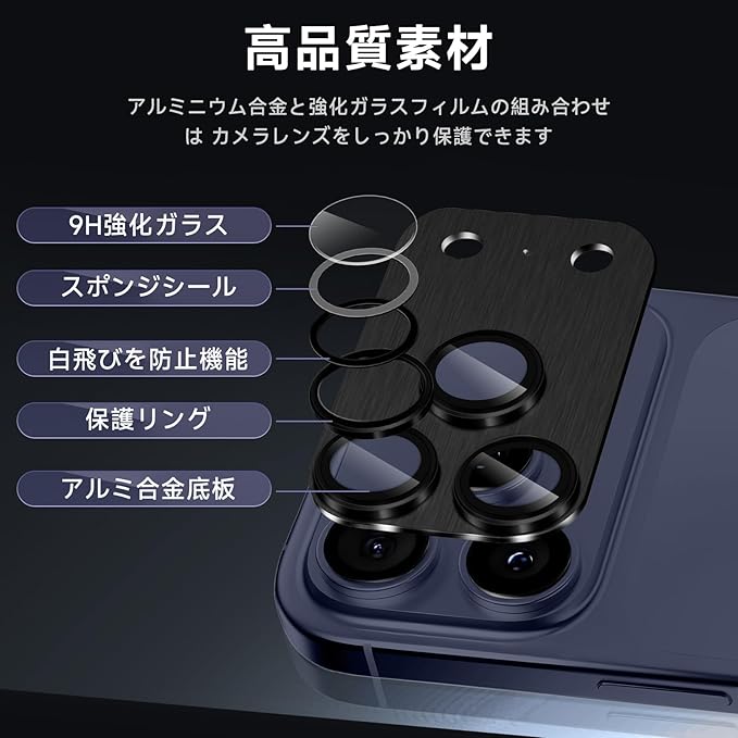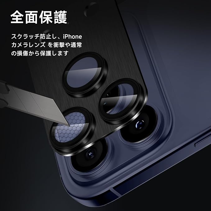 【3D全面保護】 底部にはアルミ合金素材を採用し、レンズ部分に強化ガラスを採用、カメラのデザインよりも高く、スクラッチ防止し、カメラレンズを衝撃や通常の損傷から保護します。スマートフォンを落とした場合でも、保護フィルムが側面からの衝撃を吸収し、カメラレンズへの傷や衝撃を最大限に防ぎます