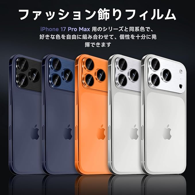 【ファッション飾りフィルム】本製品はアルミニウム合金+強化ガラス製、iPhone 17 Pro Maxシリ一ズと同系色で本体と完全に融合していく、一体感と高級感が溢れています。透過率は98%と高く、写真本来の美しさを保ったままカメラレンズを保護します