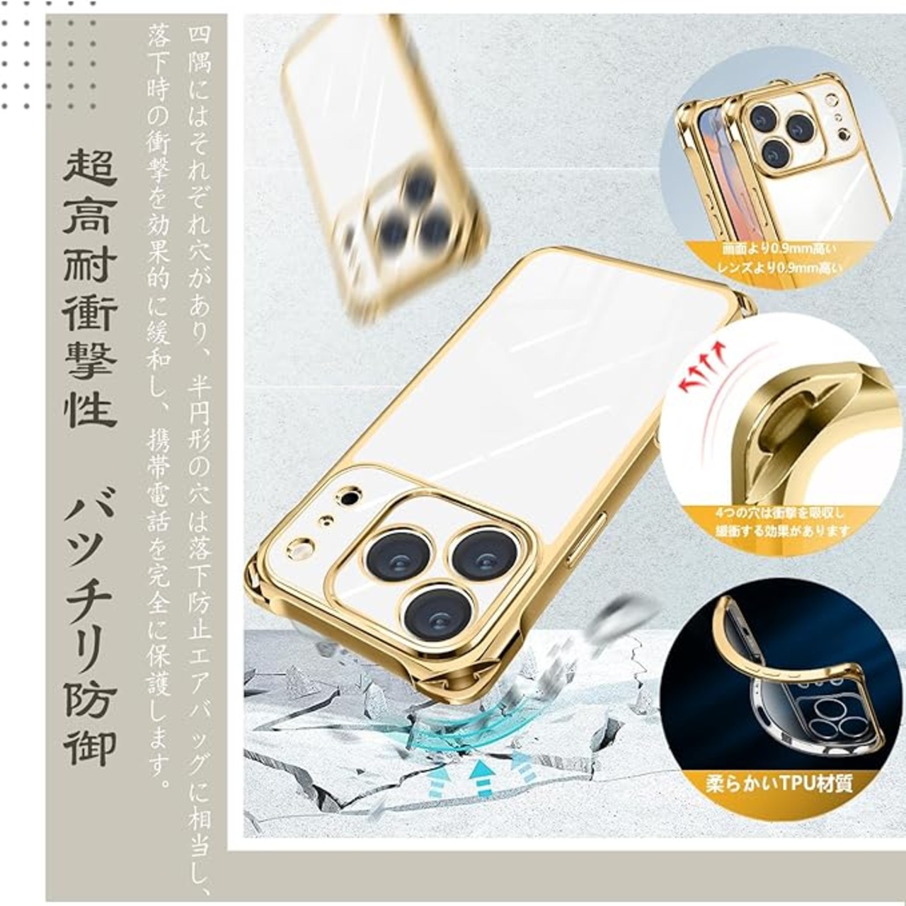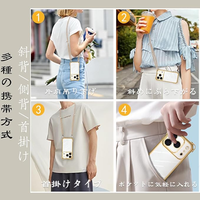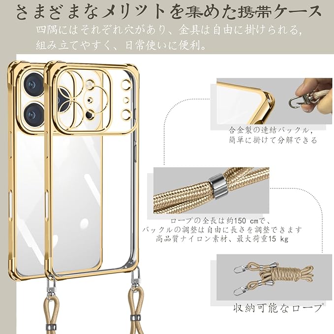 iPhone 17 Pro Max 用の ケース クリア ショルダー 耐衝撃 アイフォン17 Pro Max カバー ストラップ 透明 スマホケース 電気メッキ加工 肩がけ 首掛け 紐付き 縄掛け 斜めがけ 調節可能なショルダー TPUスマホ (ゴールド)