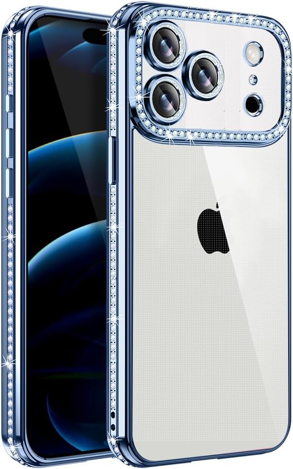 MuZiF iPhone 17 Pro Max 用 ケース クリア メッキ加工 キラキラ 背面全透明 サラウンドレンズ保護 カメラ保護 TPU ソフトケース 薄くて軽い 女性 人気 耐衝撃 ラップホール付き アイフォン 17 Pro Max 用 スマホケース (iPhone 17 Pro Max用,ブルー)