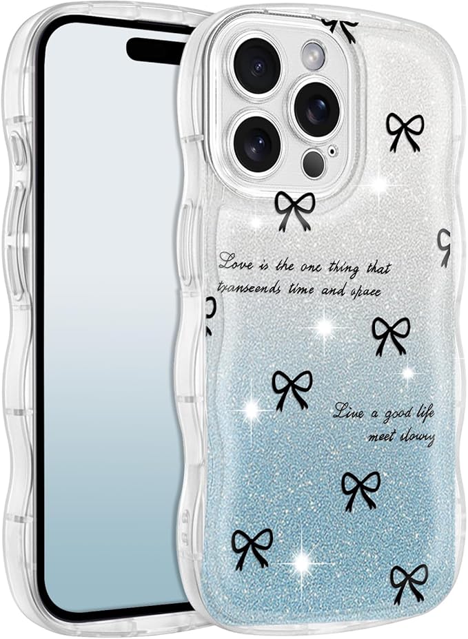 iPhone 17 Pro Max 用 ケース クリア キラキラ 可愛い 黒いリボン結び ウェーブ TPUソフトケース 透明 かわいい 薄くて軽い グラデーションです スマホケース 耐衝撃 携帯カバー 17 Pro Max 用 波型 バンパー (ブルー)