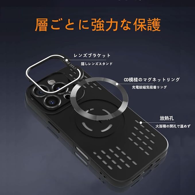 【対応機種】iPhone 17 Pro Maxは専用の設計です。対応機種を間違えないようにしてください。レンズスタンド機能を隠し、多角度自由に調節し、両手を解放します。