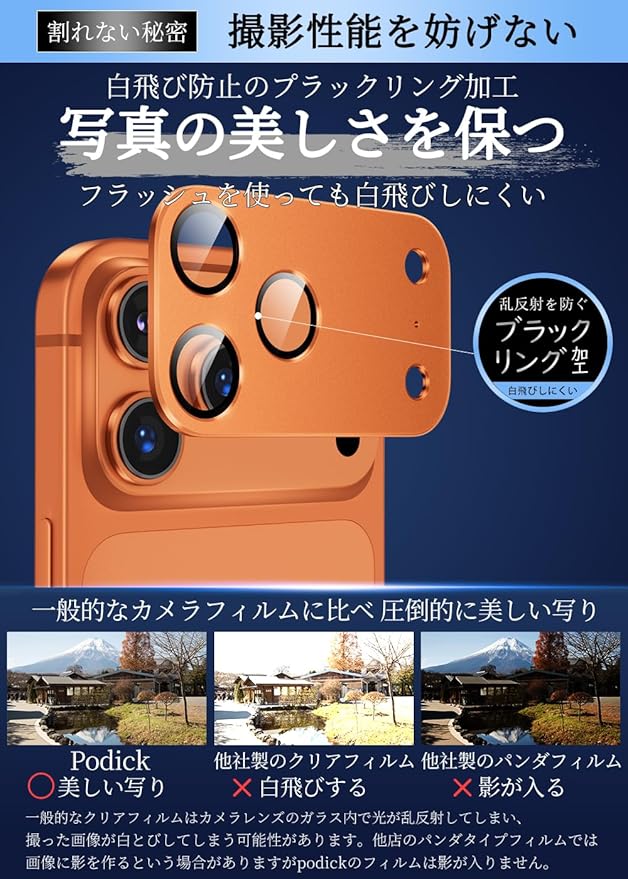 【露出オーバー防止・超高透過率】より鮮明で超クリアな高い透過率。また、露出オーバー防止のために、カメラフィルムに黒縁取りをした設計を使用しているので、いPhone 17 プロマックスカメラの自動露出機能を干渉せず、明るい被写体でも暗い被写体でも適正な明るさの写真を撮影することができます。さらに、フィルム表面には光学ARコーティング技術を施し、光の透過率は99.99%に達し、本格的な撮影体験をそのまま楽しむことができます。