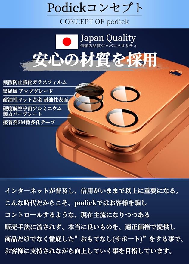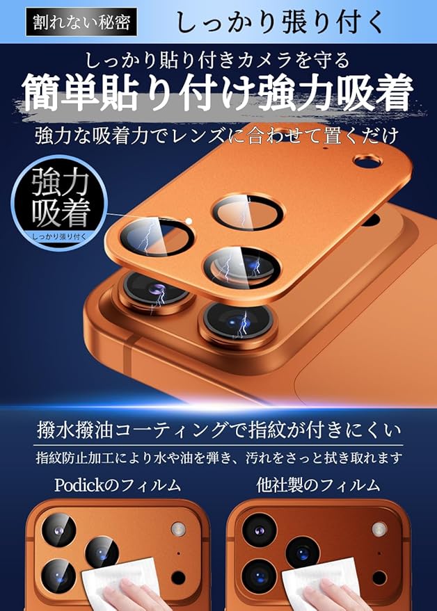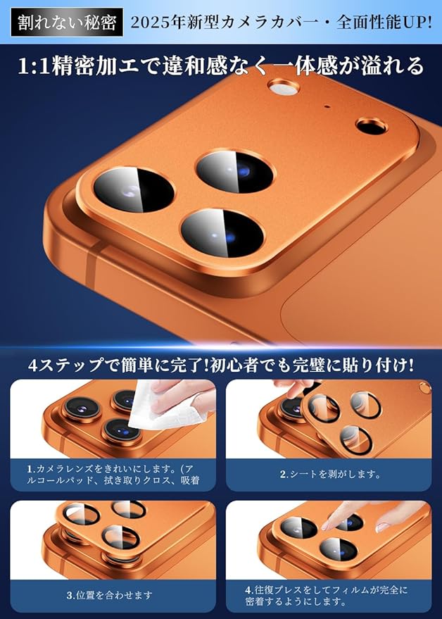 【対応機種・貼付け超簡単】iPhone 17 Pro max専用カメラレンズプロテクター。フィルム接着面にはナノ静電吸着技術を処理され、位置を合わせて置くだけで簡単に貼り付けます。誰でも気泡なく、綺麗に貼り付けます。※品質保証付き:当店でご購入の製品は1年間の保証サービスをご提供しております。『初期不良の場合』『違う商品が届いた場合』『ヒビ入り/割れた場合』、注文履歴からお問い合わせください。お客様からのお問い合わせ内容に応じて返金対応を提供いたします。