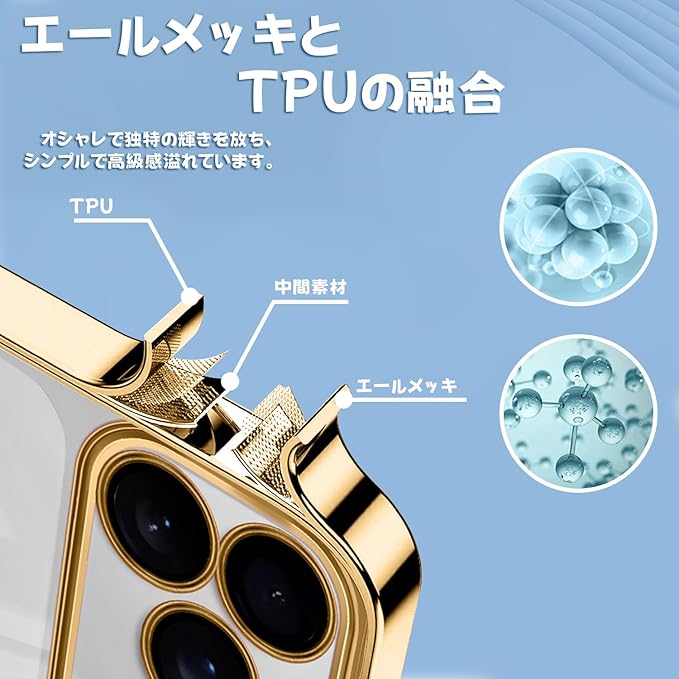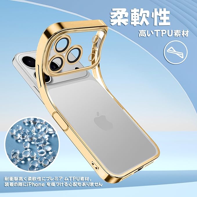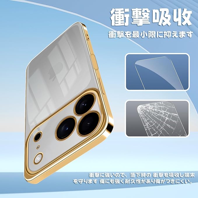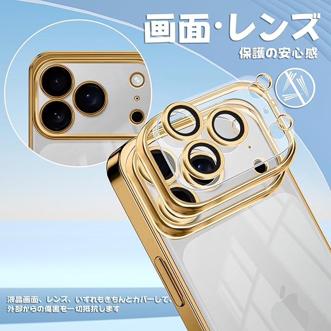 iPhone 17 Pro Max 用 ケース クリア ガラスフィルム アイフォン 17 ProMax カバー iphone17ProMax スマホケース 透明 TPUバンパー 薄型 ストラップホール付き ワイヤレス充電対応 6 .9インチ クリアケース ゴールド