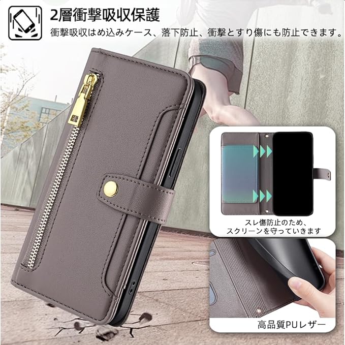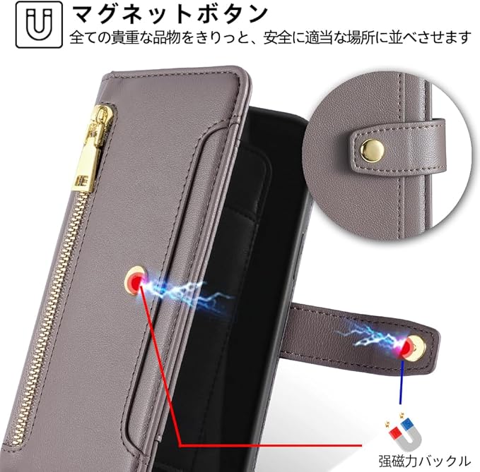 【一体型スマートフォンケース財布】 高品質PUレザー製。スマートフォンケースと多機能財布が一つに。内側にはカードホルダー 6、紙幣収納ポケット 1、ジッパー付き小物ポケット 2を完備。フラップデザインとU字型強力マグネットボタンにより、スマートフォンと貴重品の安全を確実に守ります。