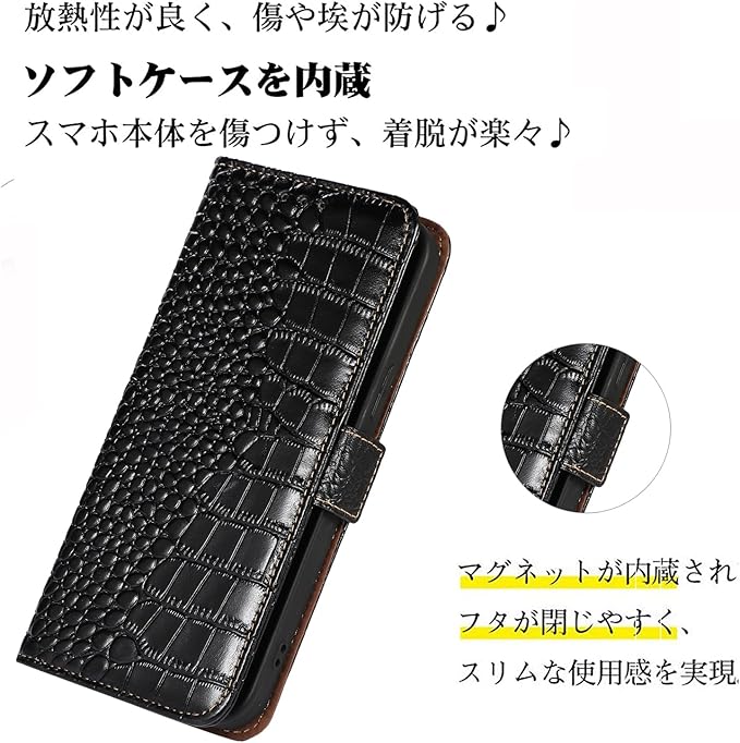 【素材】高級牛革素材・質感・縫製全てに高級感が漂う作り。手に取ると必ずご理解頂けます。キメの細かく滑らかな手触りのクロコダイルエンボスレザー。本体(外側) : 牛革(牛皮をクロムなめしした皮革)にホログラムとクロコダイル模様を転写した皮革 カードポケット : フルグレインレザー(牛皮革) 本体(内側) : シャムード(人工スエード) 内側ケース : ソフトなTPU
