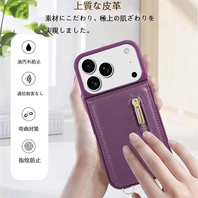 Jcxtrombulous対応 iPhone 17 Pro Max ケース 背面カード マグネットICカード収納 調節可能なストラップ付き 耐衝撃な 携帯ケース アイホン17 プロマックス スマホ PUレザー スタンド RFIDブロッキング技術ケース 6.9inchパープル