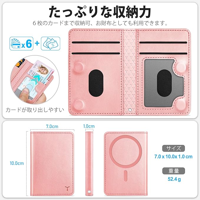 [TUCCH] スマホカードケース 磁気吸着 6枚カード収納 [RFIDブロッキング] PU合皮 脱着簡単 軽量 背面 カードウォレット 磁気ウォレットケース iPhone17/16/15/14/13/12シリーズ対応 ローズピンク