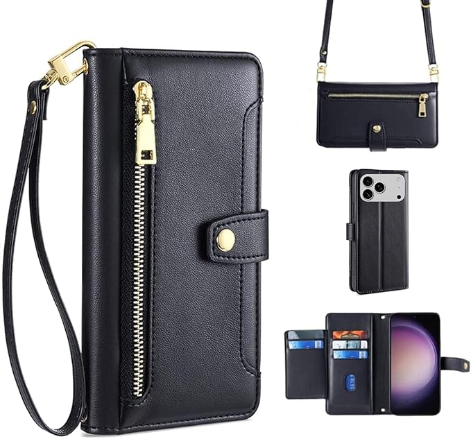 for iPhone 17 Pro max ケース 手帳型 ショルダー FOR アイフォン 17 プロ マックス 斜めがけ 手帳 ケース 財布型 【 ストラップ 長+短 2本】携帯カバー お財布付 肩がけ 首掛け ファスナー型 長さ調整可能 小銭入れ カード収納 スタンド機能 マグネット式 PUレザー ブラック