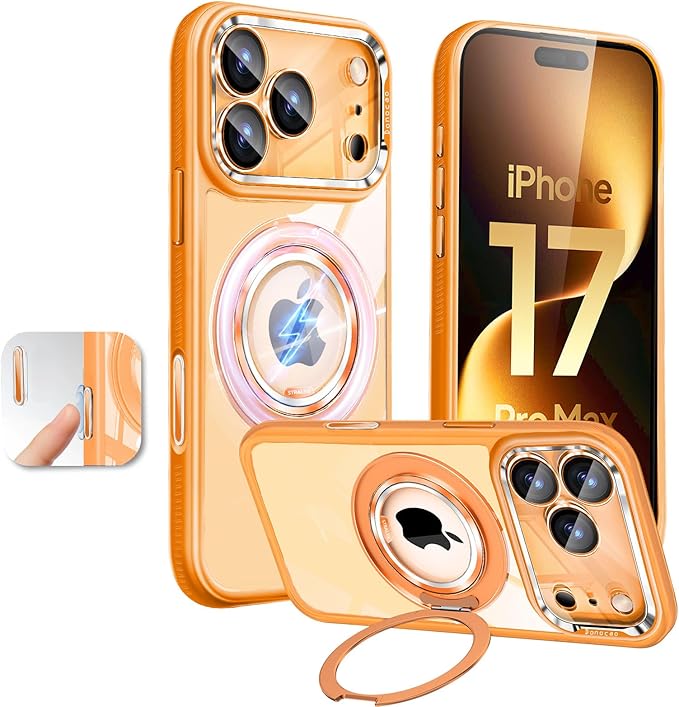 iPhone 17 ProMax用ケース MagSafe対応 クリア シリコン耐衝撃 軽量 黄変防止回転リングスタンド付き カメラコントロールカバー付き自由に取付取り外すカメラカバーレンズ保護 オシャレアイフォン17プロマックスケース オレンジ