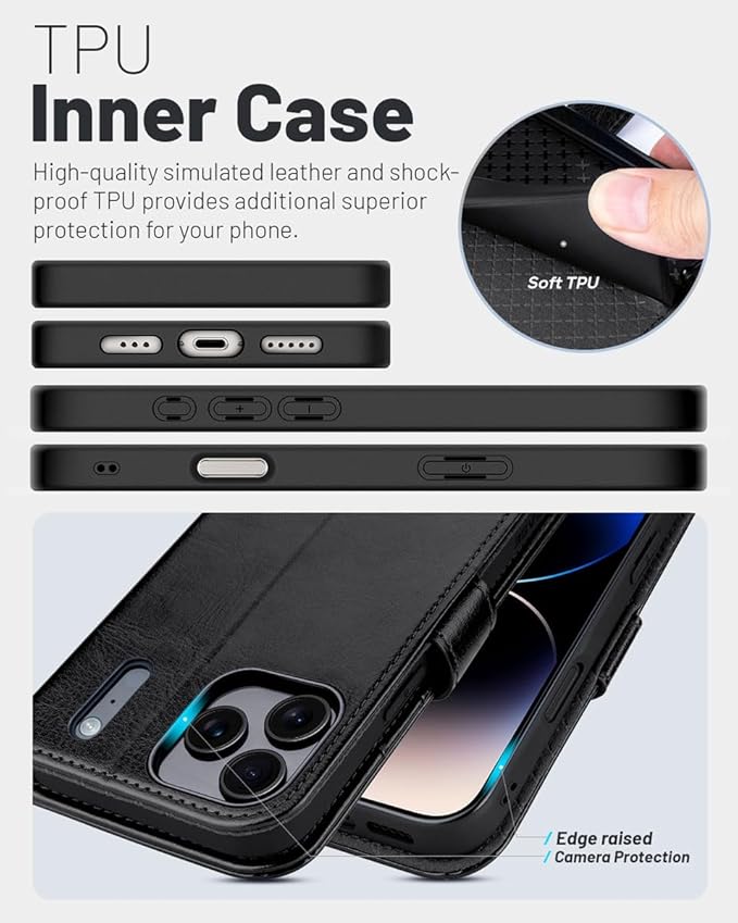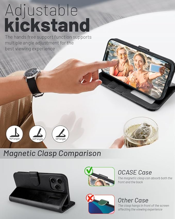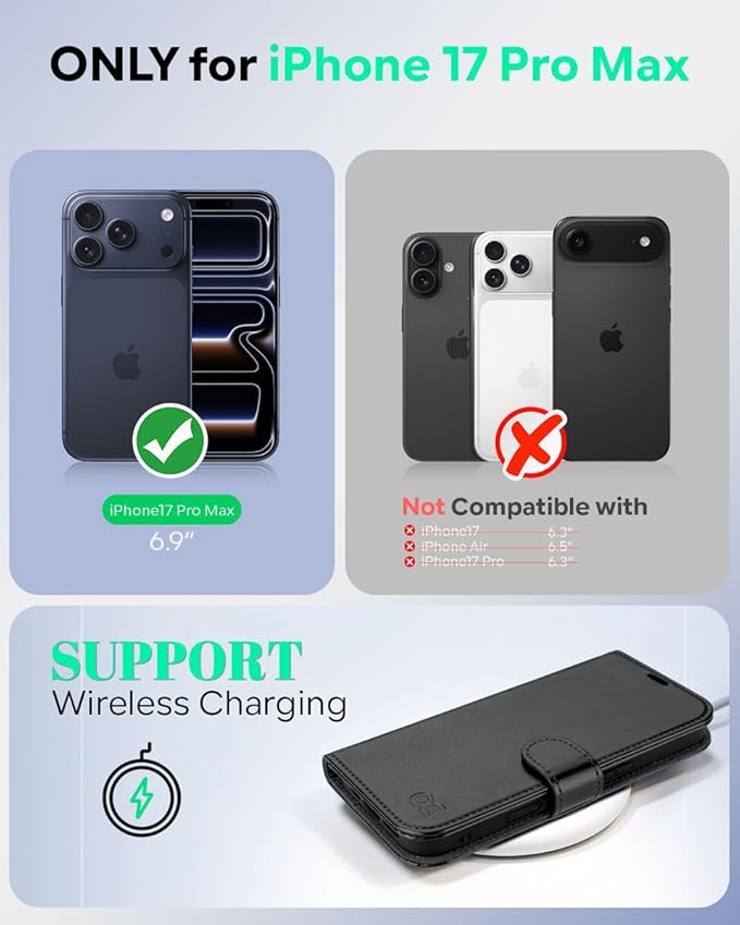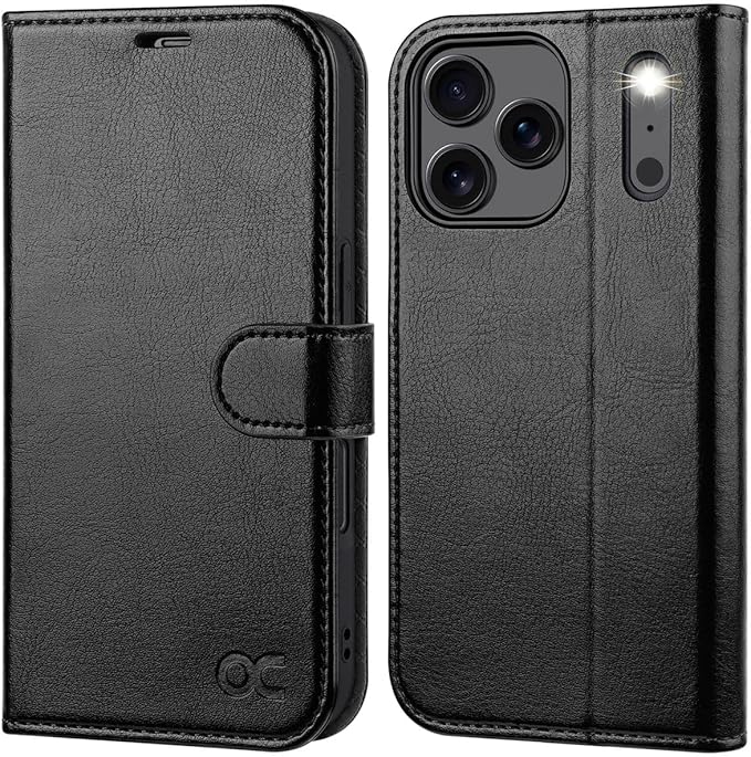 OCASE ケース ウォレット for iPhone 17 Pro Max スマートフォンカバー PUレザー フリップケース カードホルダー付き RFIDブロック機能 スタンド付き 衝撃吸収 TPUインナーシェル - ブラック