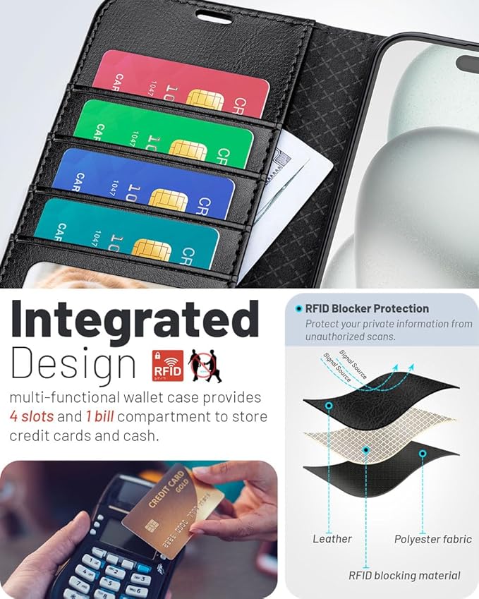 機能的なデザイン:4つのカードスロット、透明カードポケット、マグネット式開閉の財布コンパートメント、最適な視聴角度を実現する頑丈なキックスタンドを装備。RFIDシールド技術により、RFIDスキャナーによるデータ盗難からカード情報を保護します