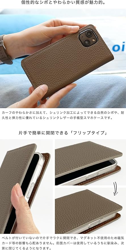 シュリンクレザーを採用した手帳型スマホケースです。シュリンク加工によってできる自然のシボは同じものは2つとなく、型押しでは表現できない独特の味わいがあり、個性をお愉しみいただけます。カーフのやわらかな質感に加え耐久性と弾力性にも優れているのが特徴です。