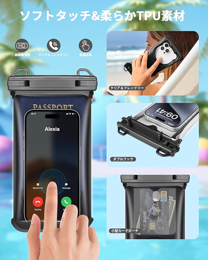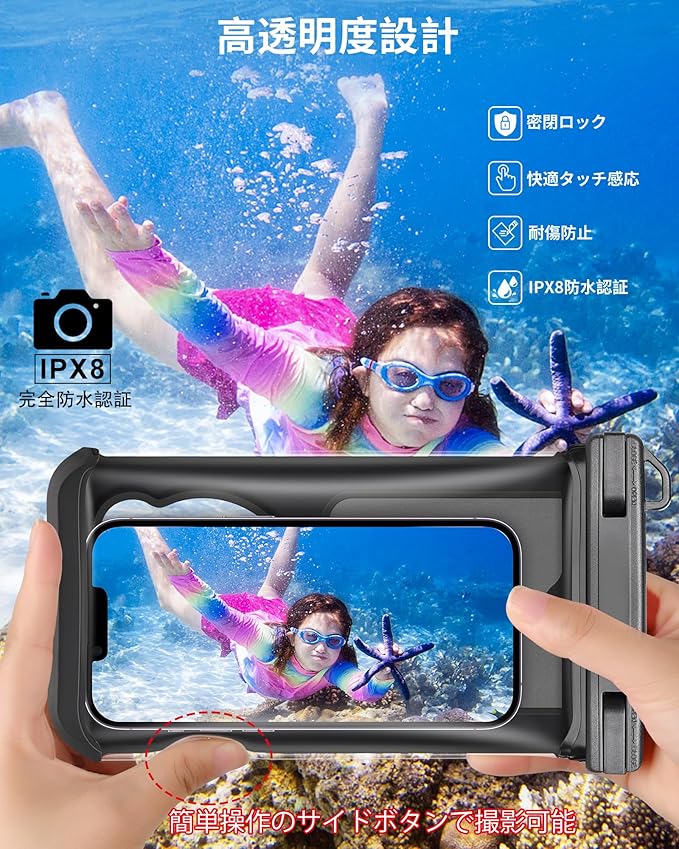 「水中撮影・透明設計」このスマホ防水ケース完全防水の表面は高透光で、光の透過率は99.99%を超え、顔認証も一瞬で完了。また、両側に3D透明化されており、例え水中でも簡単にスマホのサイドボタンを押せます。水中撮影にぴったりです。更に、防滴デザインのため水滴が残ったり,曇ったりはしません。いつでもクリアな画面で気楽に水中撮影ができます。その他、タッチ操作や電話応対などの操作もスームズにできます。★ご注意❗❗★タッチ反応しない場合、プールスマホ防水ケースの表面を綺麗にしてもっと力を入れてタッチしてください。★水圧の影響で水中撮影の際に、ボリュームボタンの使用はお勧めです。