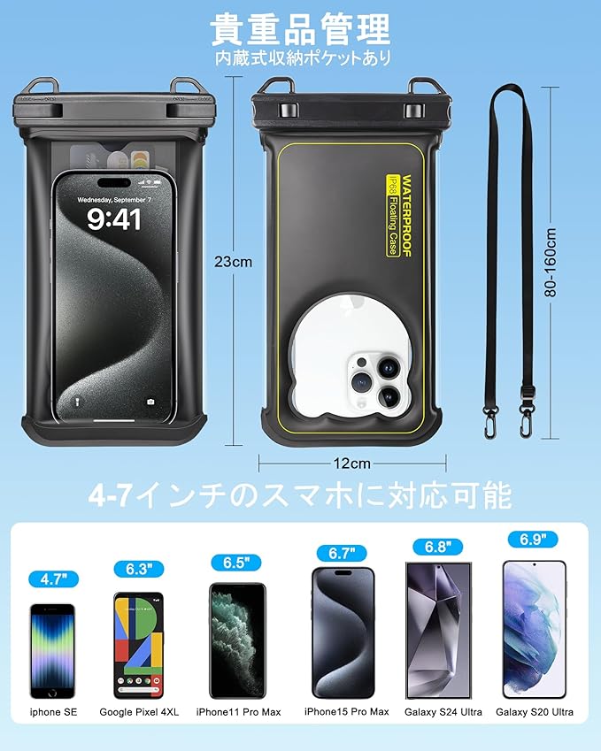 「カードポケット付き・収納便利」このiphone防水ケース内にカードポケットが付いており、パスポートや銀行カードなど貴重な部品を分別し、ポケット以外の空間でスマホ・鍵・イヤホン・お金・サングラス・化粧品などのものも便利に収めます。 ケース全体サイズ:27.5*17.5*1.5cm。約4~7.5インチ機種に対応可能。iPhone 16 15 14 plus pro promax 13 mini iPhone 12 mini Pro Max 11pro 11 XS XR X 8 plus 7 7plus 6s 6 6plus 5 5s se3 , Xperia Galaxy, Xiaomi Redmi Note 8 9 10 pro mini, huawei p20 p30 liteなど。