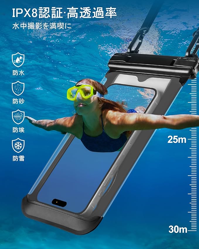「IPX8認証・完全防水」このスマホ防水ケース(一枚セット)は水に浮かべます。4層構造のため完全防水、完全防塵をすることが出来ます。また、防塵、耐寒、耐傷、耐圧に強いTPU素材で作られて、水深30mの環境でも30分間の防水ができ、全方位的な保護を提供し、安心に水中撮影が楽しめます。