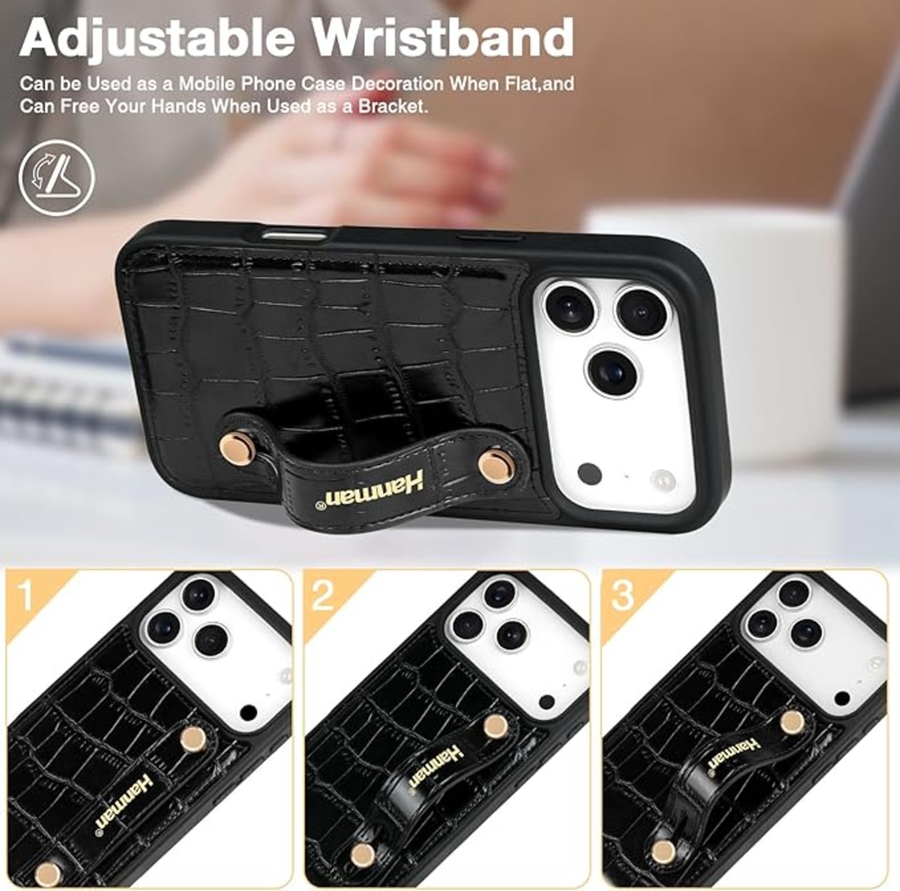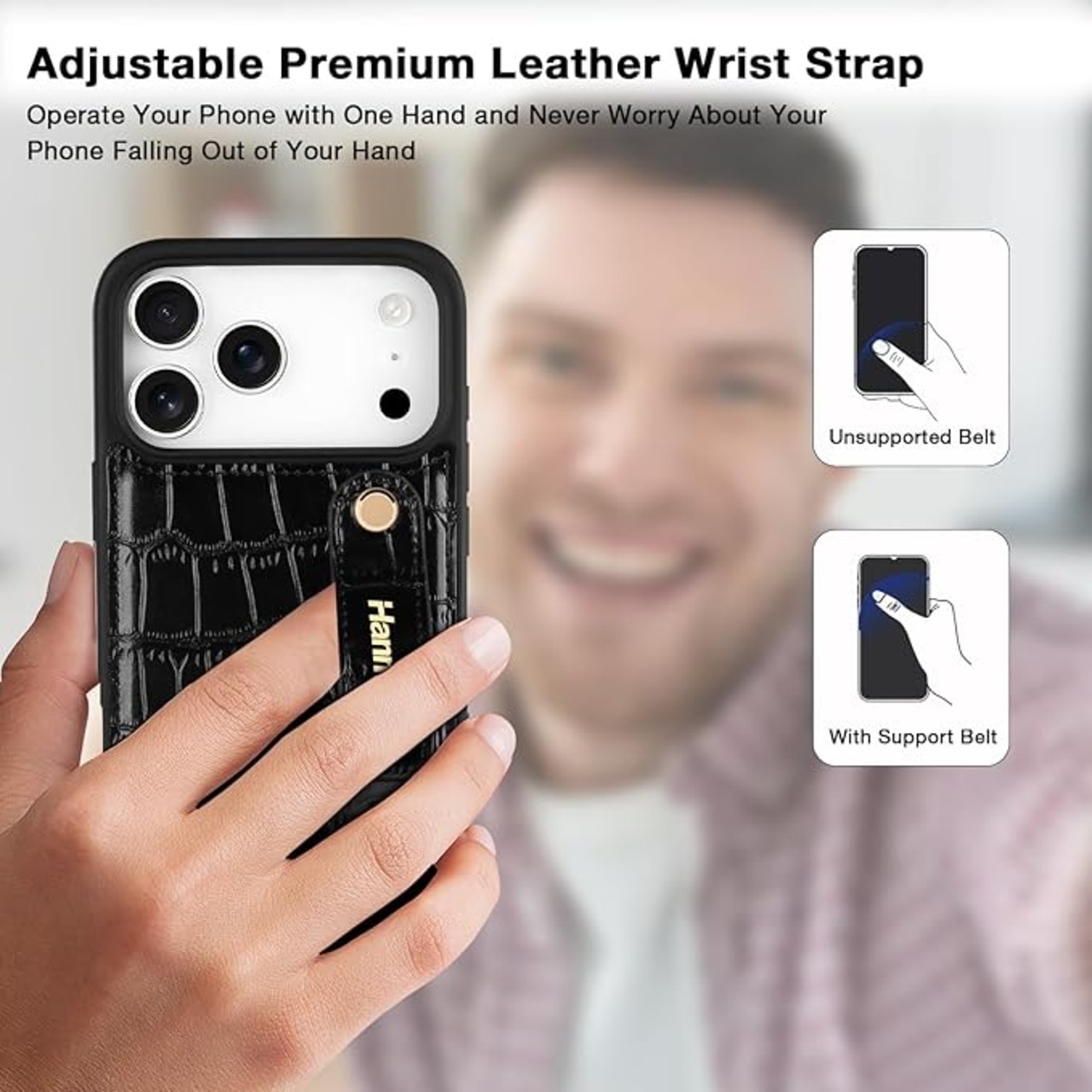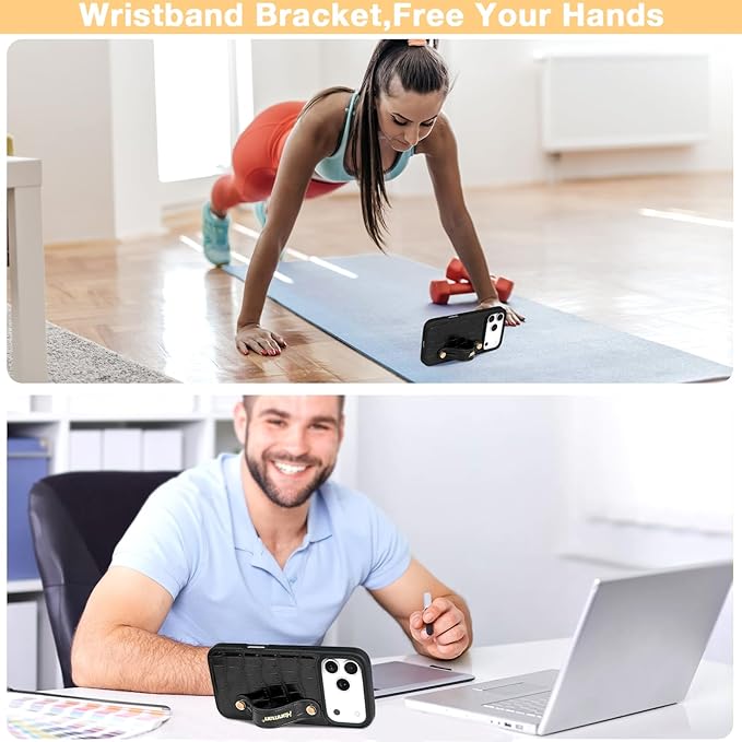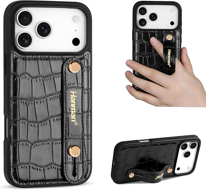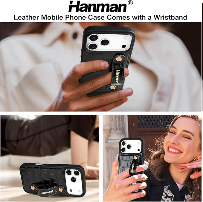 独占カスタマイズ:調節可能なリストバンドストラップキックスタンドケース付きHanmanレザーケースは 適用される iPhone 17 Pro Maxに適合しますが、他の電話モデルには対応していません。ご注文前に 適用される iPhone 17 Pro Maxリストバンドケースが必要であることをご確認ください