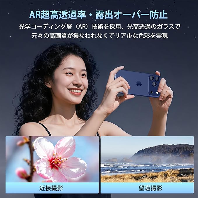 【AR超高透過率】このカメラレンズカバーはレンズ表面には光学ARコーティングが施されており、光の透過率は99.9%を実現、高品質の画像を鮮やかに反映できます。露出オーバー防止の黒い縁取り加工も施されて、ブラッシュを使っても白飛びしにくい、圧倒的に美しい写りを実現します。