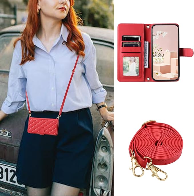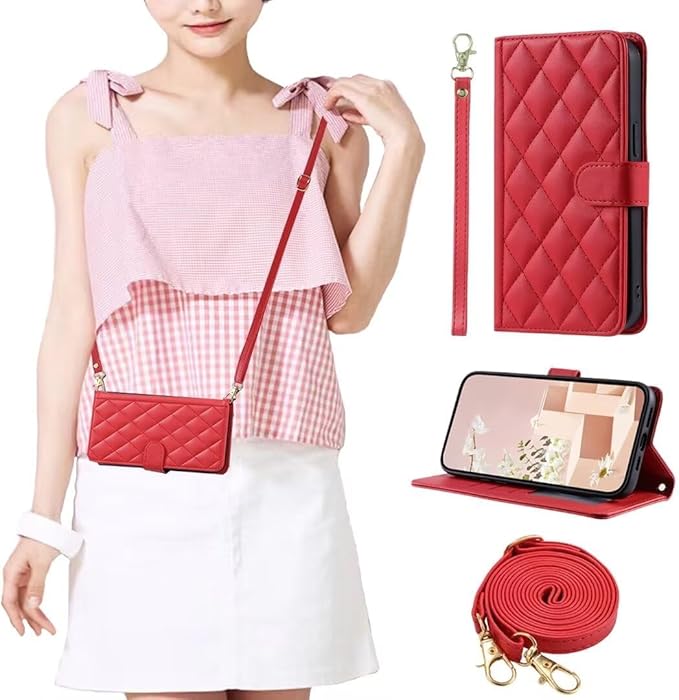 と互換性のある iPhone 17 Pro Max ケース 手帳型 いPhone17 Pro Maxスマホケース 手帳型 ストラップ付 アイフォン17プロマックス 財布型ケース携帯カバー PUレザー スタンド機能 カード収納 ストラップ付き チェック柄 刺繍 ケース アイフォン17プロマックス 財布型カバー【 ストラップ 長+短 2本】全面保護(赤)