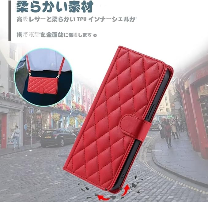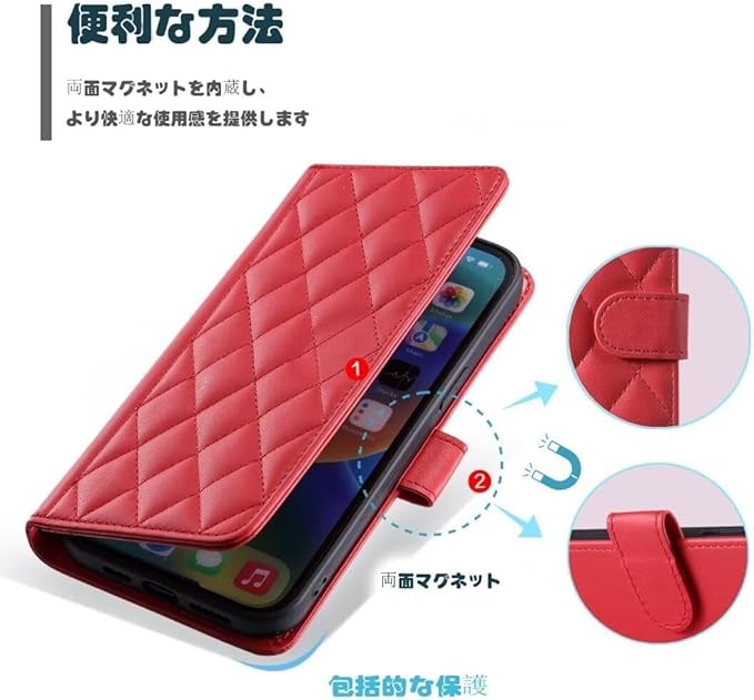 【高品質素材及び設計】大切なスマホを守る安心の手帳型。内部は衝撃吸収性に優れたTPU素材を採用して、落下時の衝撃を効率よく吸収するようにケース の各コーナー内側が設計されています。手触りが良く、キルティングの設計は控えめでエレガントです。