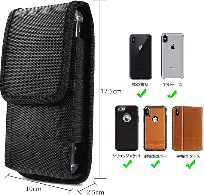 【用途】登山・作業・仕事など、さまざまなシーンで使えるスマホベルトポーチです。腰ベルトに固定して、デジカメやスマホなどを収納するのに便利。旅行や散歩、ウォーキングなどのアウトドアでも、身軽に出かけたいときに必要なものだけを入れて使えます。非常に実用的なアイテムです。【装着方法&素材】本ポーチはさまざまな幅のベルトに取り付け可能。マジックテープ式の留め具で素早くスマホの出し入れができます。カラビナ付きなのでベルトループにも簡単に装着でき、持ち運びもスムーズです。5.5インチ以内のスマホや、同サイズのデジタルカメラなどの小物類も収納可能。本体には高密度600Dナイロンを使用し、衝撃から大切なスマホをしっかり保護します。さらに撥水加工済みで防水・防汗性にも優れ、急な雨や水辺でも安心してお使いいただけます。軽量で手触りが良く、汚れにくく耐久性にも優れています。また側面に弾性があるため、スマホの出し入れがスムーズです。【サイズ】本体サイズは縦17.5cm 横10cm 幅2.5cm、重量は約80g。様々なスマホに対応できるよう設計されています。【対応機種】縦17cm 横9.5cm 幅2cm以内のスマートフォンに対応。例:Samsung Galaxy S7/S8、Galaxy Note 5、S7 Edge、iPhone 12 Pro Max、Galaxy S20+/S21 FE/S20 FE、S20 Ultra/Note20 Ultra/Note10 Lite、iPhone11/11 Pro/XR/X/XS/8/8 Plus/7/7 Plus/6s/6/6 Plus、Galaxy Note Edge/Note 4、Pixel3、ZenFone 5 / 5Q ZC600KLなど。【サービス】弊社は製品の品質に自信を持っています。ご不明な点がございましたら、どうぞお気軽にメールにてお問い合わせください。お客様の満足を第一に考えております。