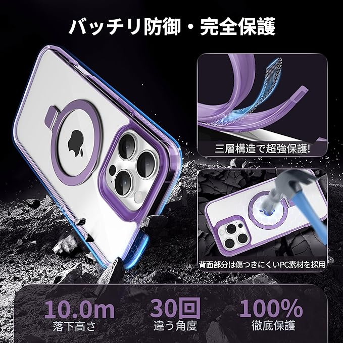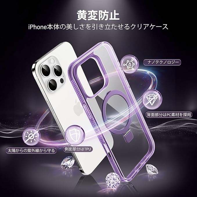 【隠しスタンド リング・MagSafe対応】Flyzooケース用のiPhone 16 Pro Max [ワイヤレス充電対応 多機能一体] クリアで透明な 黄ばみ防止 米軍MIL規格 耐衝撃 高耐久性 傷つけ防止 滑り止めグリップ マグネットホルダースマホ保護カバー 6.9インチ(パープル)