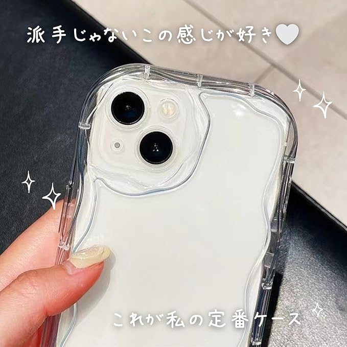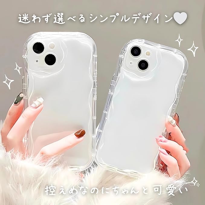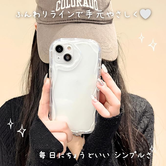 【モコモコ波状フレーム 大人可愛いデザイン】 立体感のある波状(モコモコ)フレームが特徴のクリアケース。左右非対称のウェーブがナチュラルで、派手になりすぎず可愛い雰囲気を演出します。スマホ本来のデザインを活かしながら、ほんのり柔らかな印象をプラス。シンプルで飽きのこないルックスで、どんなシーンにも馴染む大人可愛い一品です。