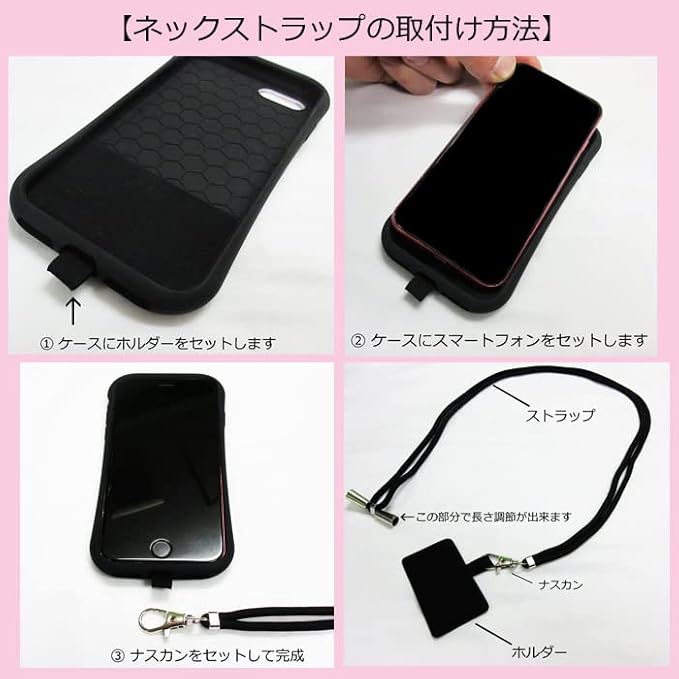 肩掛けもできるスマホショルダーストラップとカラビナストラップが付きます。