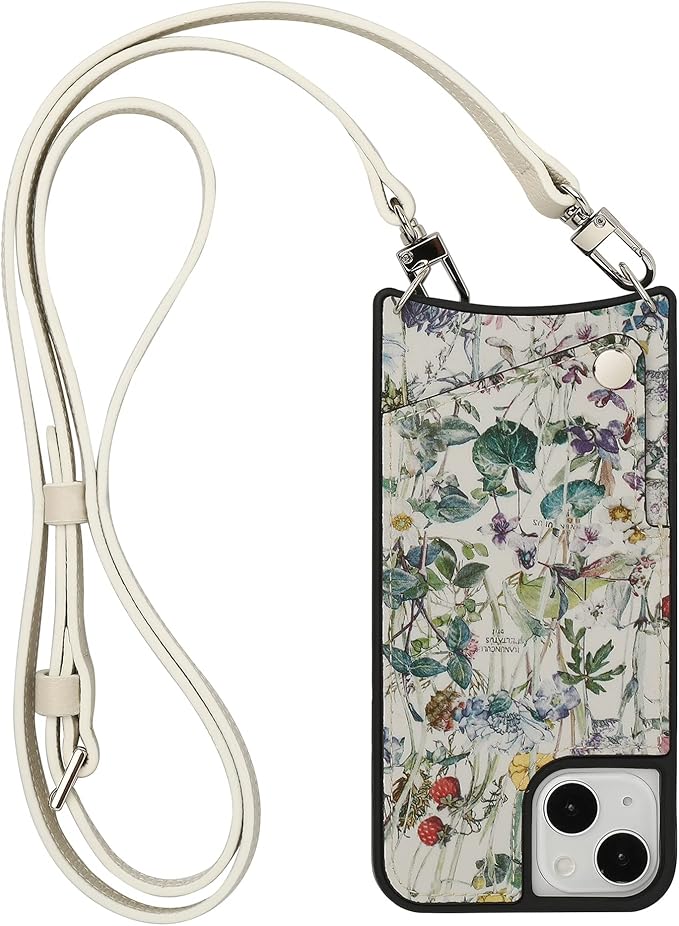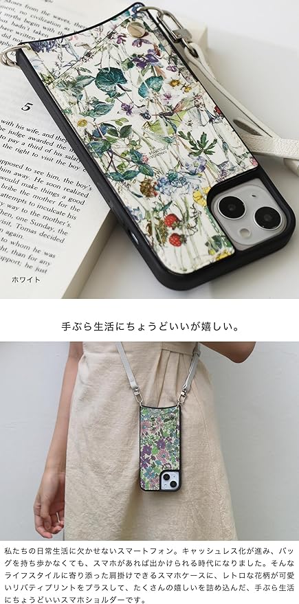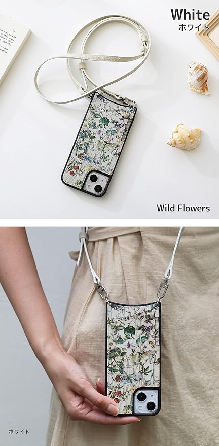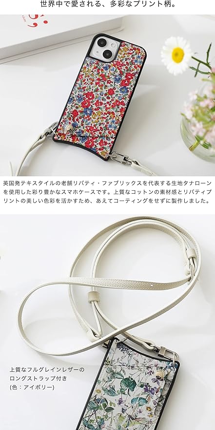 リバティプリント 本革 スマホケース iPhone用 17 Pro Max 互換性 対応ケース ワイルドフラワーズ 花柄 スマホショルダー カード収納 ロングストラップ (ホワイト(Wild Flowers))