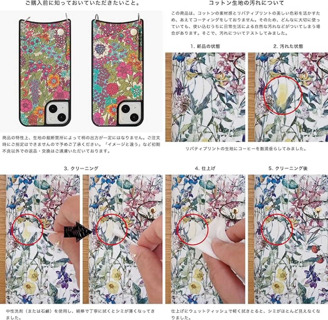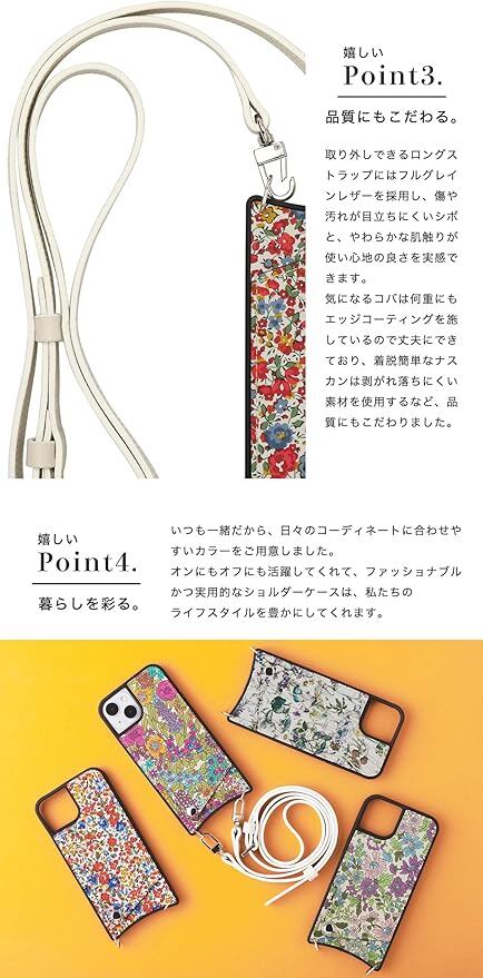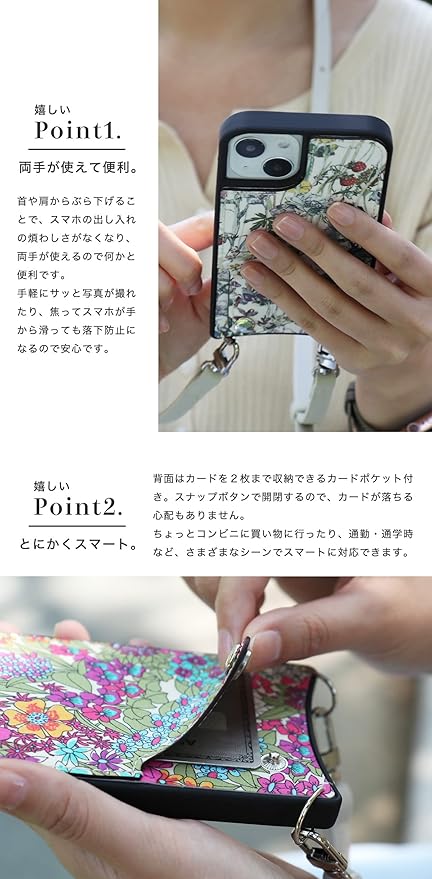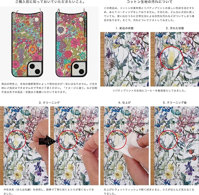 【素材】背面はリバティプリント(上質なコットンの素材感とリバティプリントの美しい色彩を活かすため、あえてコーティングをしておりません)。ストラップには耐久性に優れたフルグレインレザーを採用。ミリング加工による個性的なシボ(絞り模様)と、やわらかな肌触りが魅力的です。ケース本体はシリコン(ブラック)です。※仕入れる生産ロットや裁断箇所により、色合いや模様の出方が若干変わる場合がございます。「イメージと違う」など初期不良以外での返品・交換はご遠慮いただいております。予めご了承ください。