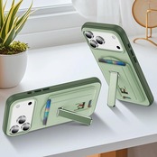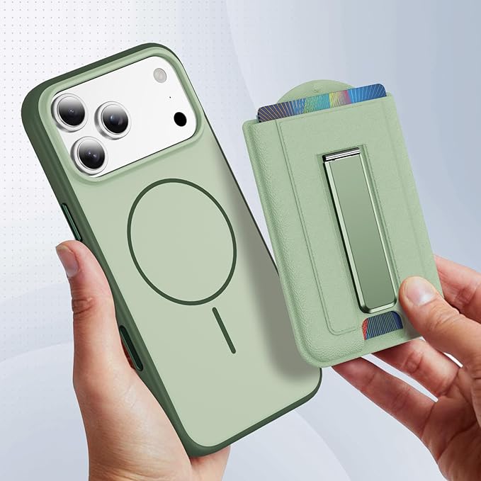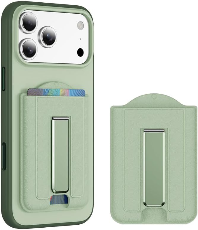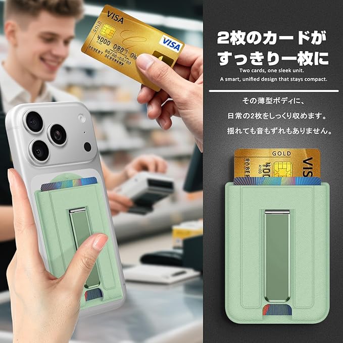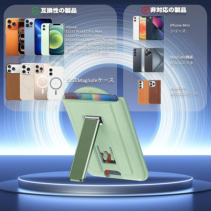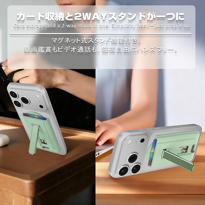 マグネット MagSafe対応 カード ケース スマホ スタンド 2枚収納 magsafe 財布 マグセーフ ウォレット マグネット カード ホルダー カード収納 ヴィーガンレザー カード入れ 取り外し可能 角度調整 スタンド機能 iPhone 17 Air 16e 16 15 Plus Pro Pro Max/14/13/12 に対応 (グリーン)
