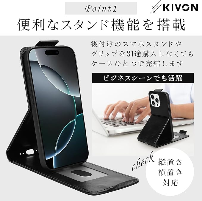 【縦開き&自立式】スタンド機能を備えた縦開き構造で、ビデオ通話やリモート会議中もスマートに使えます。机の上に自立するため、両手が空いて作業効率もアップ。 【ビジネスに映える高級感】上質なPUレザーを使用し、落ち着いたカラーバリエーションでビジネスシーンにも最適。カバンやスーツとの相性も◎ 【カードポケット付き】内側にはカードを1枚収納できるスリムなポケットを搭載。ICカードや名刺など、必要最低限の携帯に便利です。 【薄型&精密設計】本体にしっかりフィットする専用設計で、カメラやボタン周りも快適に操作可能。ケースを装着したまま充電もOK。 【KIVONブランド品質】機能性とデザイン性を両立したスマホケース。 ※環境に配慮した簡易包装のため、パッケージに若干のシワが見られる場合がございます。品質には影響ございませんのでご安心ください。