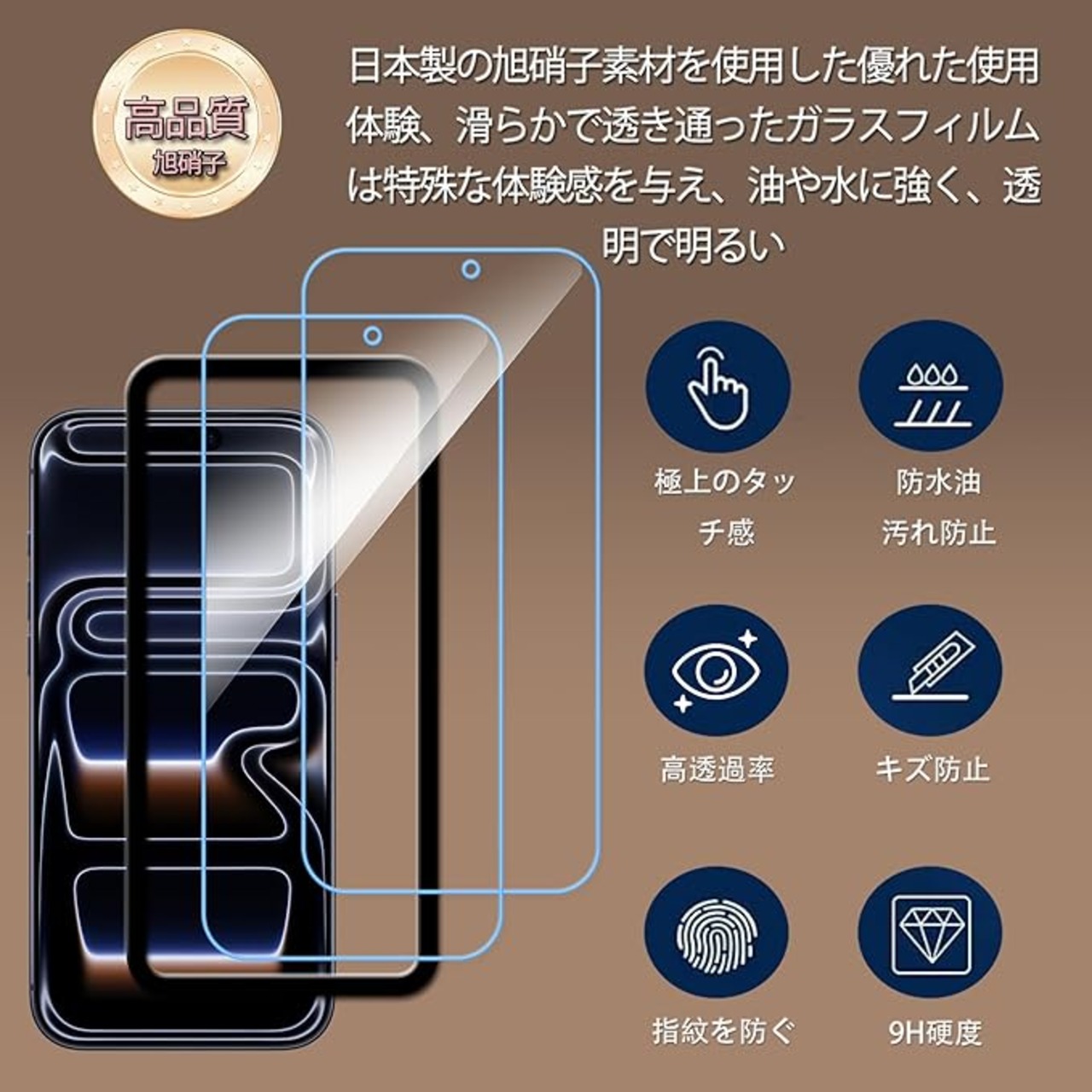 特徴 ブルーライトカット,日本製素材,耐衝撃性,9H表面硬度,飛散防止,極上の透過率,極上のタッチ,自動吸着,気泡ゼロ,指紋防止,全面保護