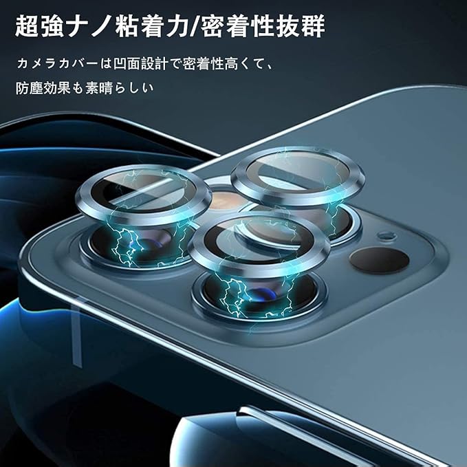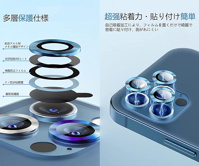 【指紋防止・気泡ゼロ・貼付け簡単】強化ガラスカメラフィルムの表面は指紋防止コーティングが加工されるため、指紋が付きにくく、汚れが付いても布で拭くだけできれいになります。保護シールを剥がし、レンズの位置を合わせて上から軽く置くだけで気泡が入ることなく簡単に貼り付けられます。