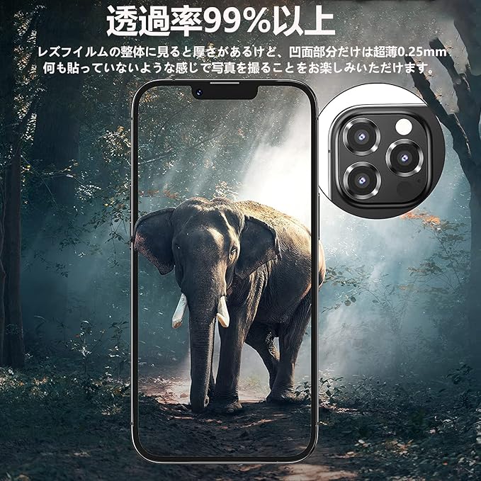 【超高透過率】強化ガラスに光学コーディング層(AR)技術を採用し、高い透明度を実現します。レンズ部分を保護しながら、iPhone本来の高画質を楽しむことができます。わずか0.25mmの極薄型で、違和感もなく本体の設計も損なわないです。