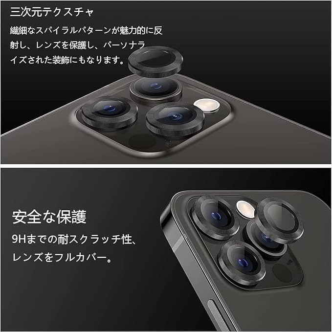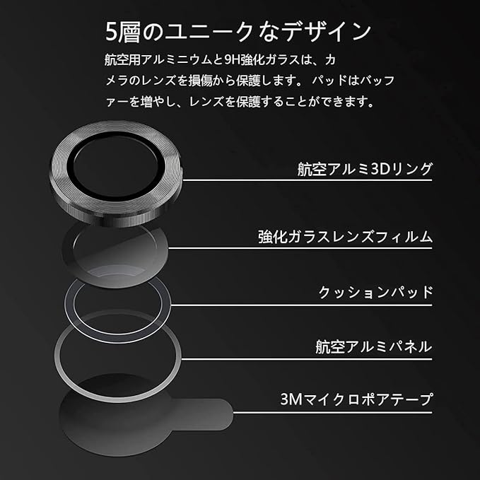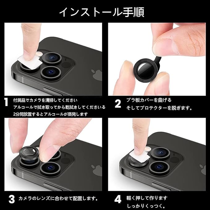 【指紋防止・気泡ゼロ・貼付け簡単】強化ガラスカメラフィルムの表面は指紋防止コーティングが加工されるため、指紋が付きにくく、汚れが付いても布で拭くだけできれいになります。保護シールを剥がし、レンズの位置を合わせて上から軽く置くだけで気泡が入ることなく簡単に貼り付けられます。