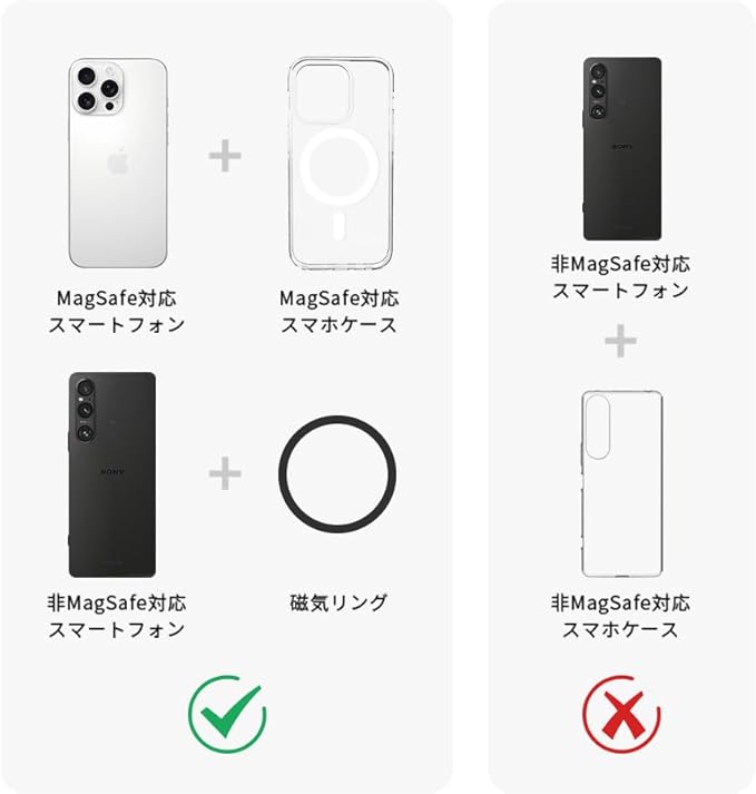 【幅広い互換性】iPhone17/16/15/14/13/12シリーズだけでなく、MagSafe対応のAndroidスマートフォンにも使用可能。iPhone本体やMagSafe対応ケースに直接貼り付けて使用し、MagSafe充電を行いたい時は簡単に外すことができます。家族や友人と共有したり、機種変更後も引き続き使えたりするため、長く愛用できるのが魅力です。