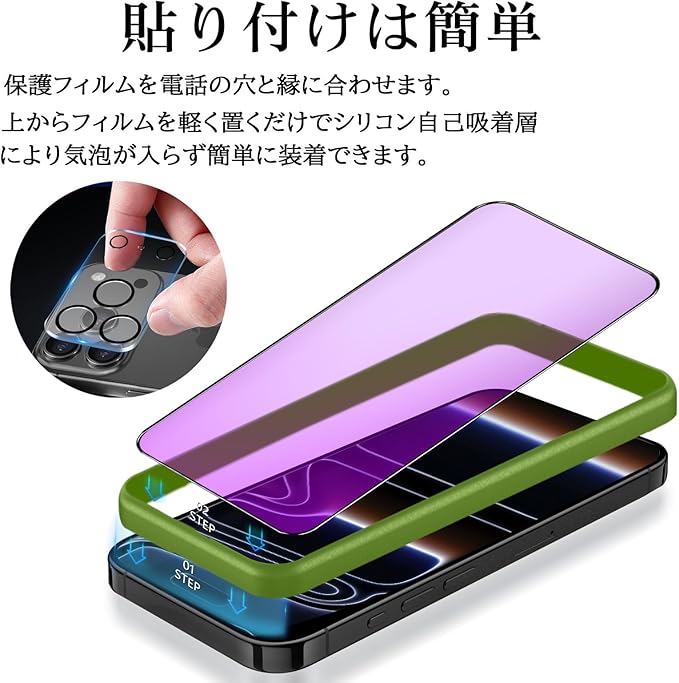 【貼り付け簡単 】ガイド枠をはめる→上側に合わせて、フィルムを置く→軽く押すだけで自然に吸着。初めての方でも簡単に貼り付けられるよう、専用の貼り付けガイド枠を同梱しています。スマートフォンと保護フイルムがズレることなく、だれでも簡単にフィルムを貼ることができます。
