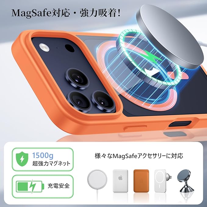 【MagSafe対応で一瞬高速充電!】あいふおん 17 pro maxケースのバックパネルに38個の強力なN52マグネットを搭載し、振っても安定感抜群の高速充電を実現!充電しながらゲームも楽しめ、ワイヤレス充電や各種MagSafe対応アクセサリーにもピッタリ対応しています。※予めご了承ください:磁力があるため、電子決済の反応も弱くなる可能です。